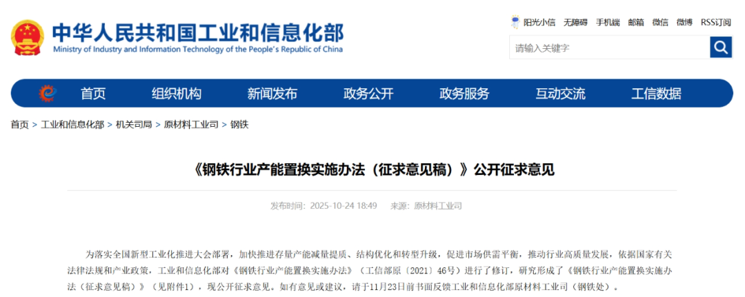 工信部網(wǎng)站10月24日消息,工業(yè)和信息化部對《鋼鐵行業(yè)產(chǎn)能置換實施辦法》進行了修訂,研究形成了《鋼鐵行業(yè)產(chǎn)能置換實施辦法(征求意見稿)》,現(xiàn)公開征求意見。